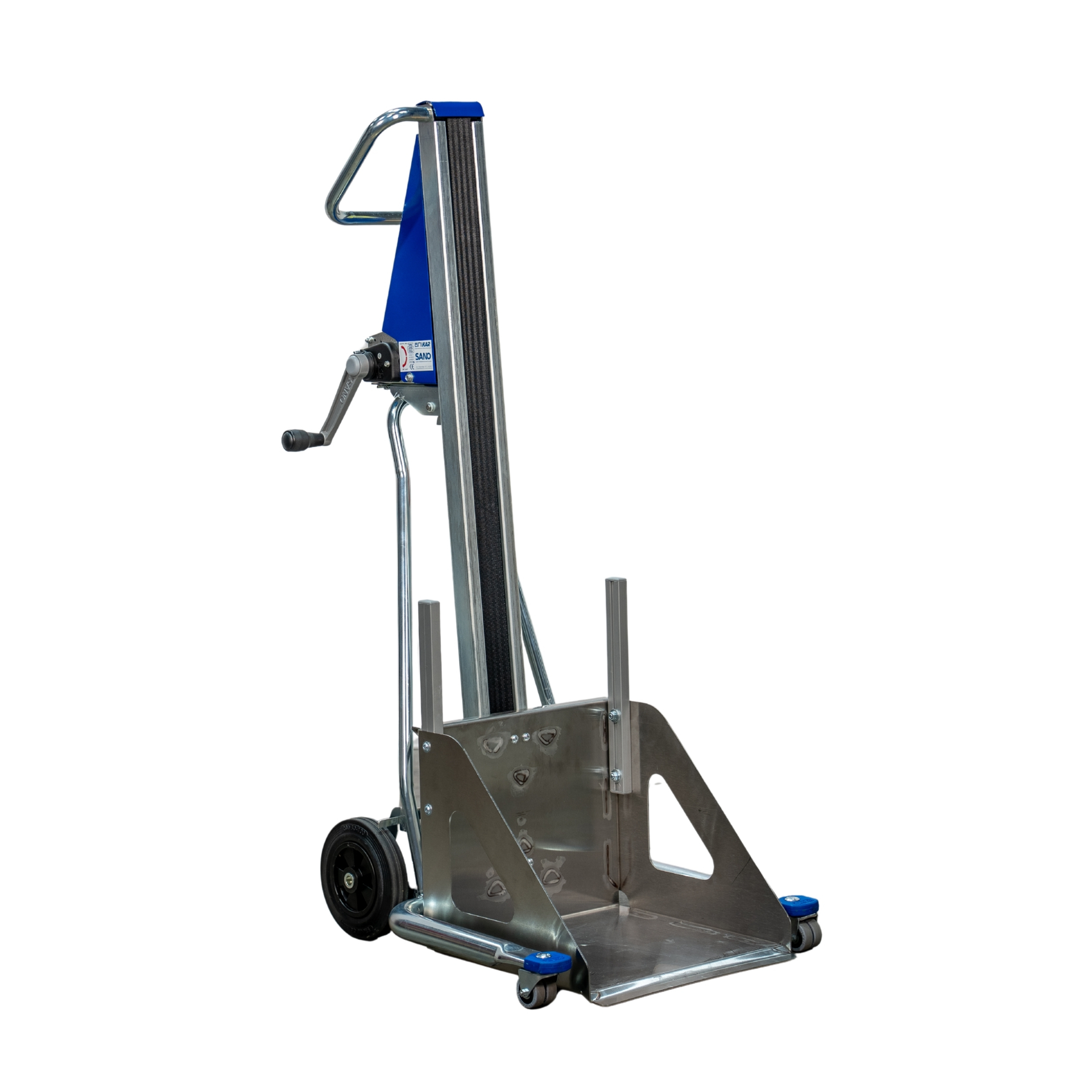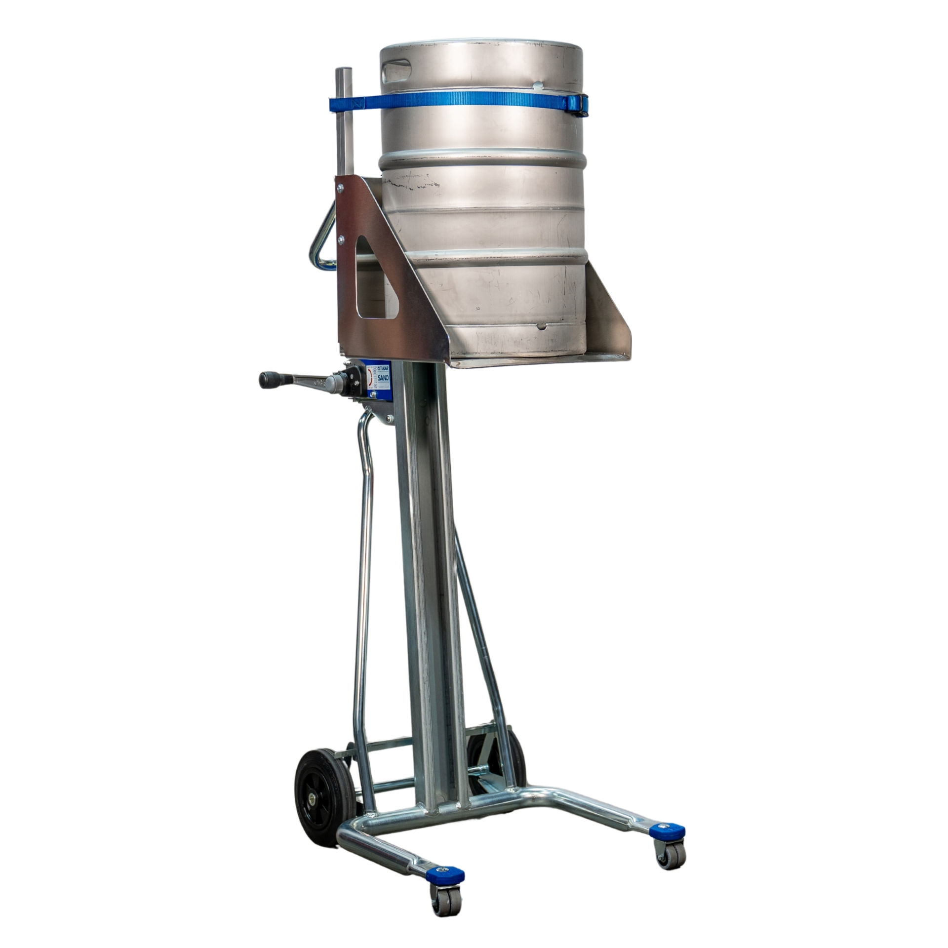 The KegKar Nitro is a specialized keg-lifting hand truck designed for controlled vertical transfers on flat surfaces. Featuring a precise mechanical winch crank and secure stabilization feet, it easily lifts half-barrel kegs up to 43 inches. It is the perfect, fatigue-reducing solution for safely loading truck beds, storage racks, and multi-tier shelving systems.