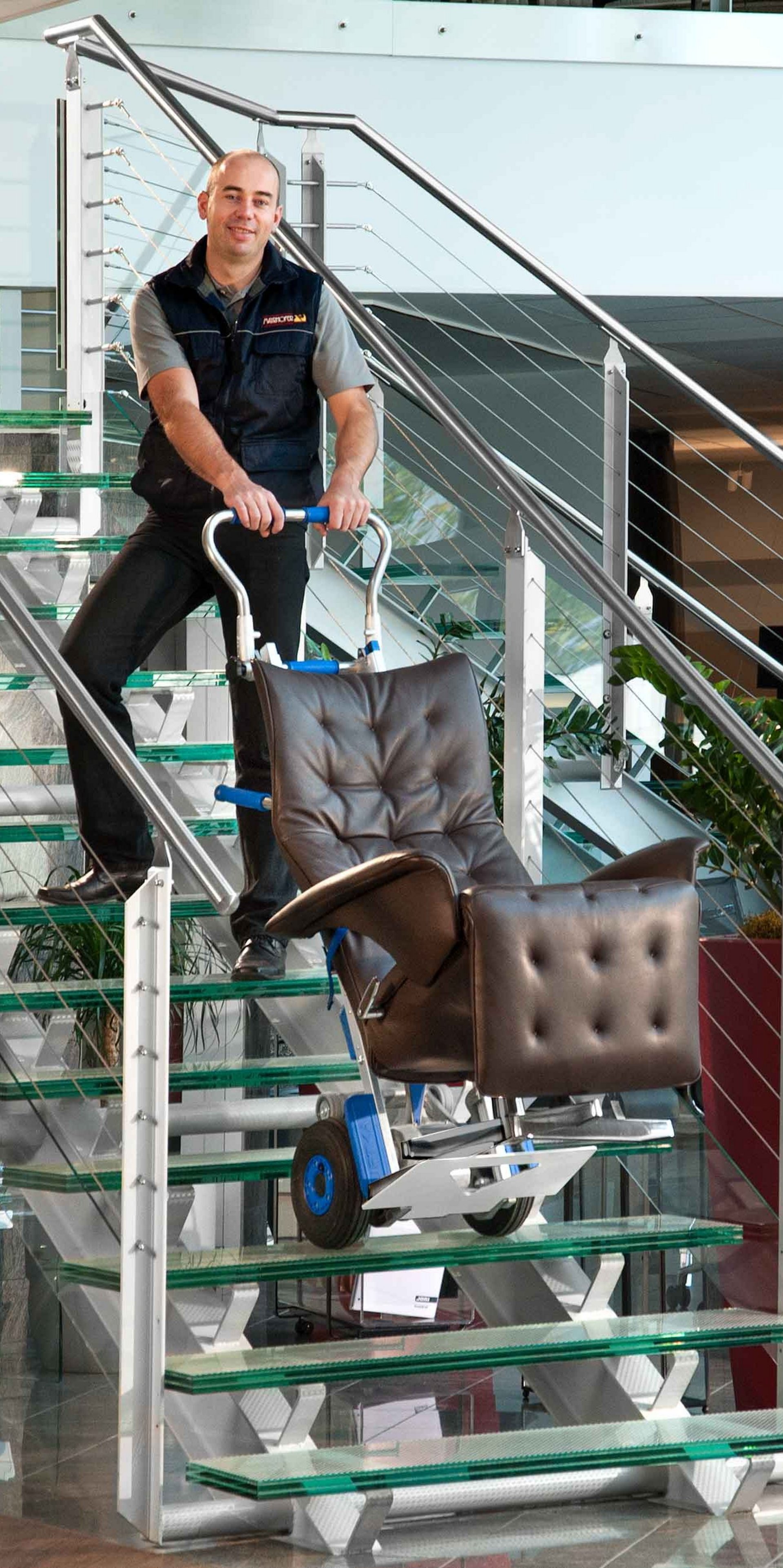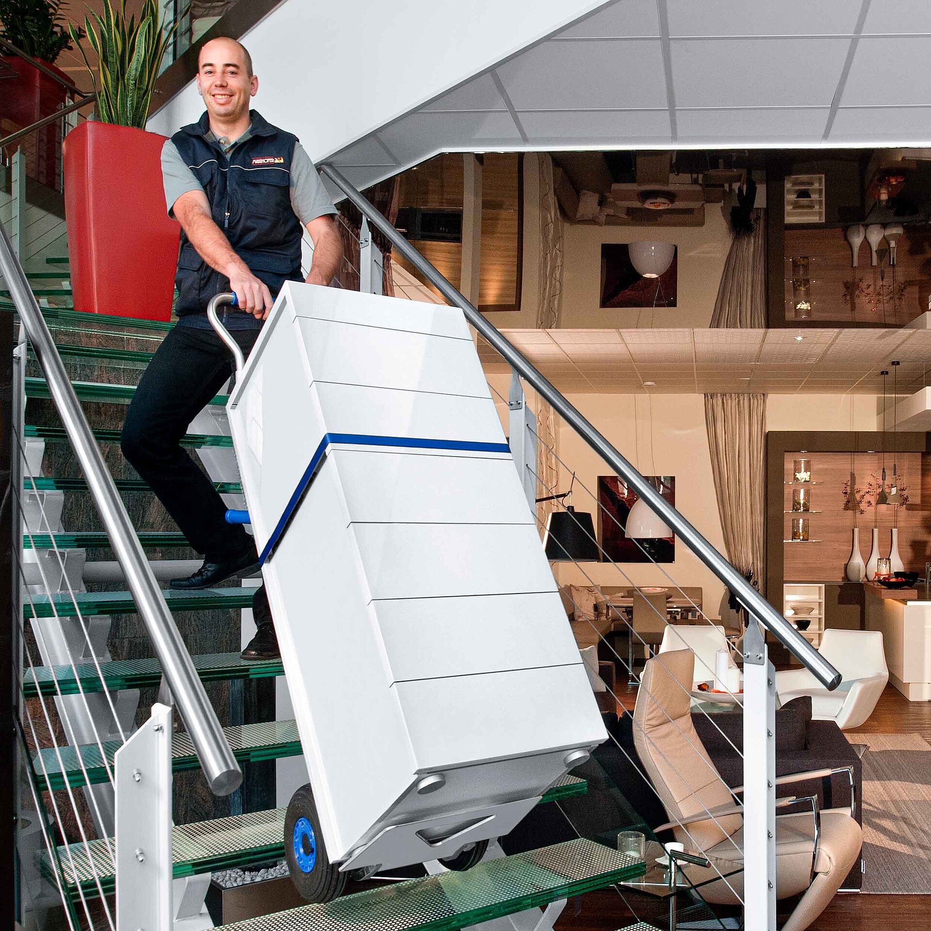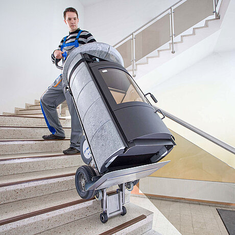 Such loads can be moved effortlessly and transported up stairs, which not only enhances work efficiency but also safeguards your company's most important asset: 'Healthy employees.' Discover the performance of our equipment and optimize your entire delivery process.