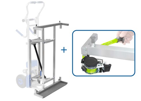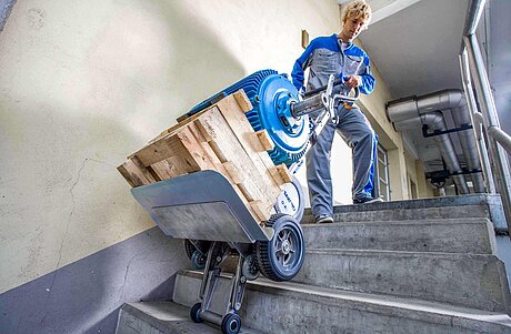 The LIFTKAR HD Fold Dolly gives you all the advantages that the LiftKar HD Fold offers for compact and heavy loads on stairs on the level as well. Once you've managed the stairs, the integrated Dolly system comes into play on level. It's not only about going up and down stairs. You'll often need to cross car parks and company premises too. With the Dolly system you can now do that a great deal faster. With the support wheels folded out, heavy loads can be pushed over level ground with the minimum of effort.