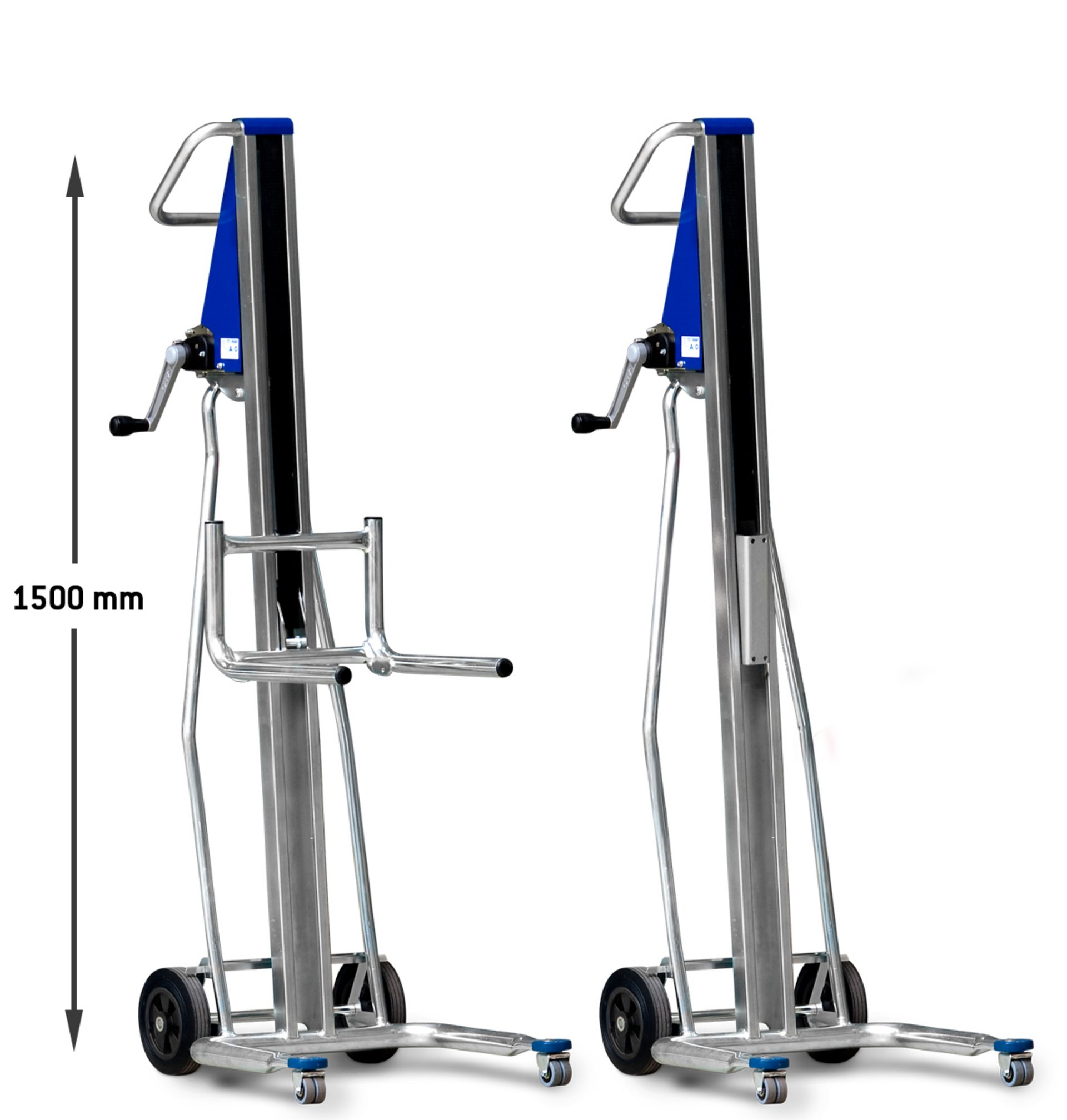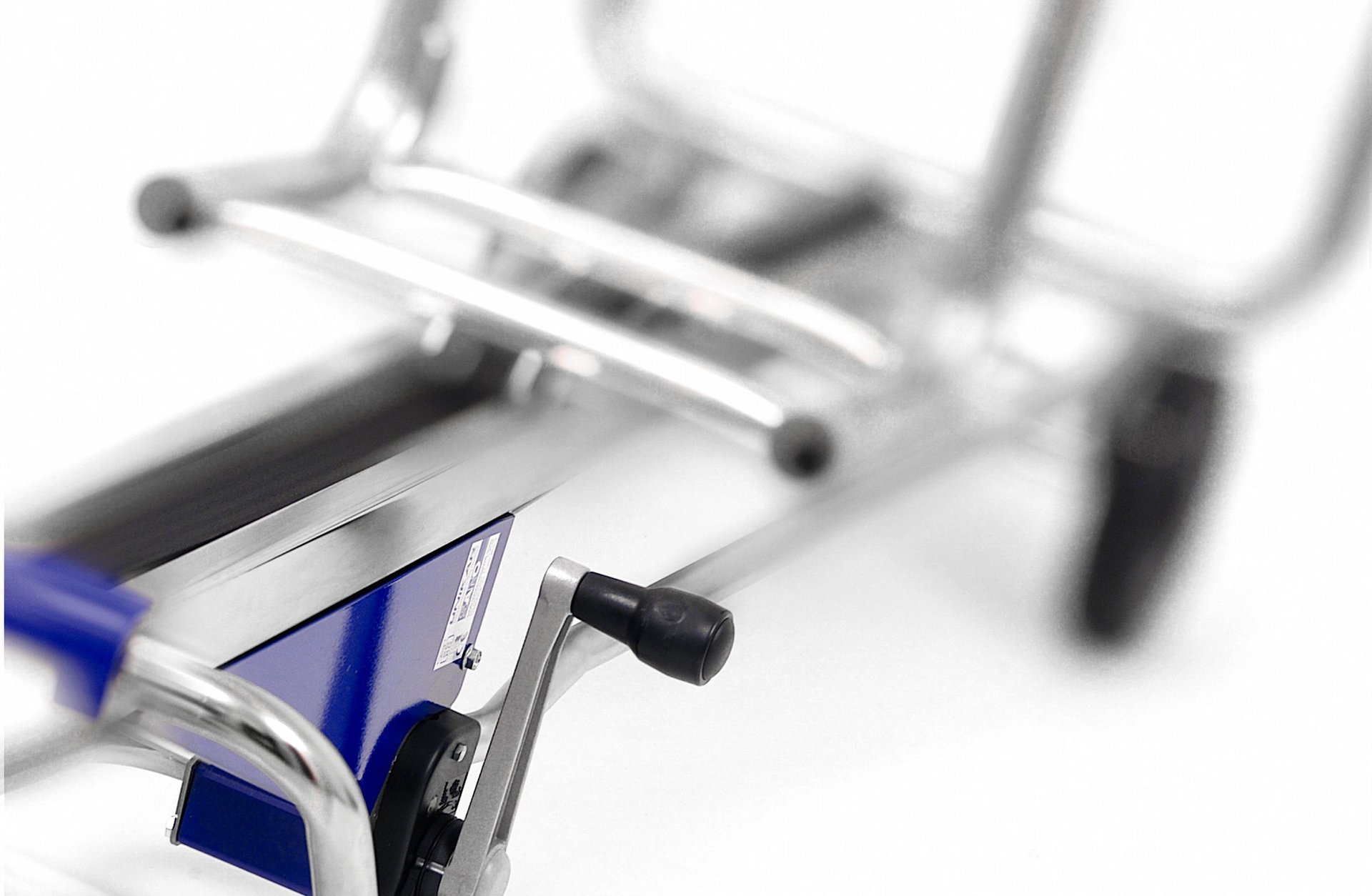 The UniKar is constructed in such a way that we have fitted a 50-mm-wide strap (2 in strap) instead of a chain or a steel cable. This makes it low-noise, maintenance-free and clean. And you can carry loads of up to 265 lbs despite its low weight of only 55l lbs. Two basis models and a range of optional equipment match the UniKar lifting hand trucks to every situation. The standard version of the UniKar lifting hand truck is supplied with a lifting height of 1100 mm (43 in). Additional lifting heights of 1300 mm (51 in) up to max. 1600 mm (63 in) are available on request (intervals of 100 mm / 4in).