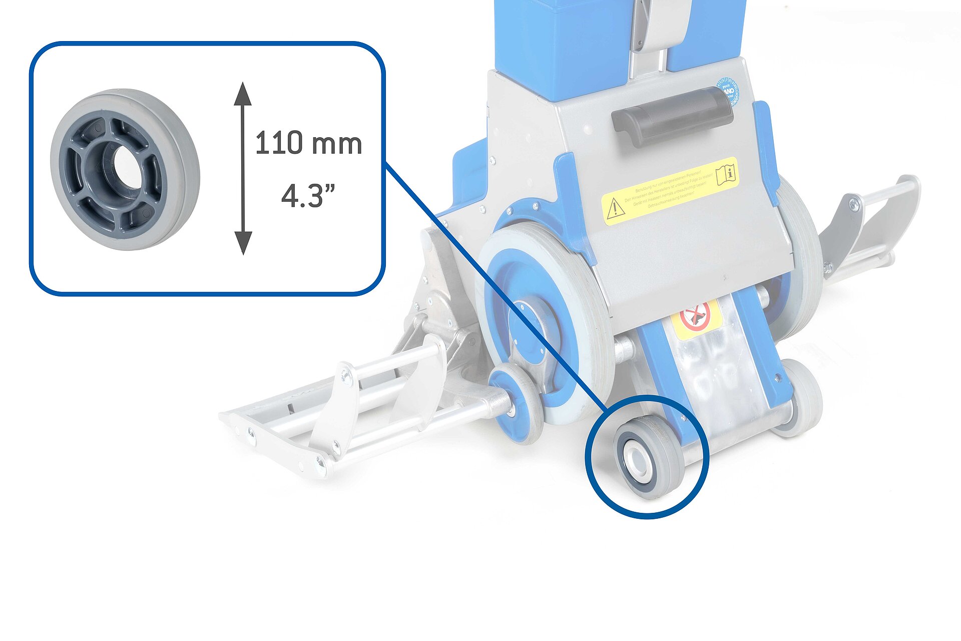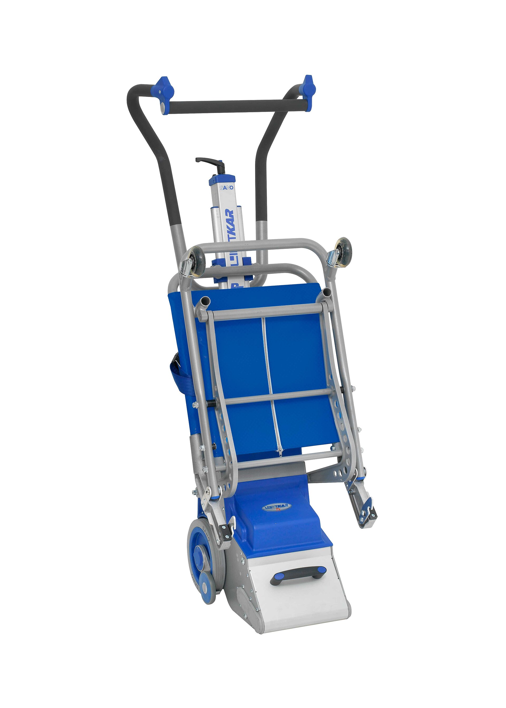 With 8 in diameter wheels and a track width of just 11.7 in the PT-Fold is ideal for very steep and narrow spiral staircases. You will quickly become familiarised with the intuitive controls on the Liftkar PT stairclimber. The most important thing is to get a feel for balance while operating the stairclimber. The integrated level switch is a great help in this respect. New personnel will quickly learn to handle this system with confidence.