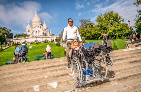 With large, non-marking wheels and a wide wheelbase, the LIFTKAR PT Outdoor is easy to manoeuvre smoothly and safely over steps, slopes and bumpy ground outside the home. This model is available for people up to 264 lbs or 331 lbs. The powerful braking system inside the wheel is activated when the stairclimber is tilted back slightly. This effectively prevents it rolling away on slopes or ramps. Switching between single-step and continuous mode can easily be done while on the move.